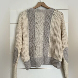 Ribbed crew neck, mixed cable knit gray and ivory color block, long sleeves with a ribbed cuff and contrast elbow patch,