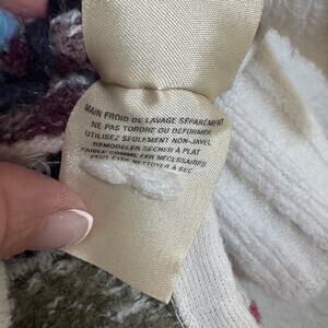 Size XS/S. Soft, cozy mixed-fiber knit with ribbed arm openings and colorful hand-stitched embroidery accents in pink, olive, burgundy, and navy.