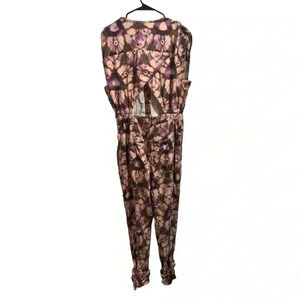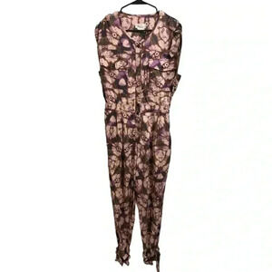 Trendy and unique jumpsuit. Fun pattern. Button down closure halfway down the front. Sleeveless. Buckle detail to bottom of legs. Functional side pockets. Chest pockets. Cutout detail to back.