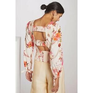 Off-white with pink floral print, 100% cotton, smocked bodice, back cut outs, long sleeves with tie cuffs, scoop neck, size medium.