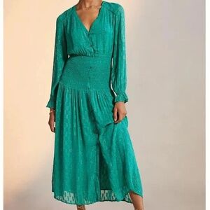 Anthropologie Smocked Maxi Dress Green w Gold Swiss Dot Size Small