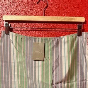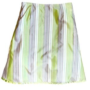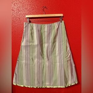 Pastel striped skirt by Snak for Anthropologie A line silhouette with vertical stripes in pastel green, purple, pink, blue, and white. Trimmed in green ribbon at the hem. Petticoat under the skirt. Hidden zipper and hook & eye closure on the side. Hits just below the knee, depending on height