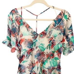 Anthropologie dress, floral ruffle mini dress, tropical summer outfit, resort wear, vacation dress, feminine day dress, garden party dress, flowy beach dress, lightweight printed dress, boho summer style, B7