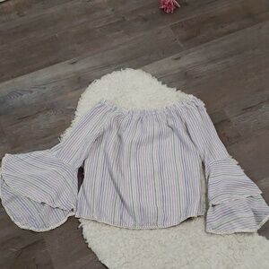 Anthropologie guest brand Solitaire Adorable up shoulder multicolored striped top. Can be pulled up more on top of shoulder as well. Beautiful lace detail around belled sleeve and bottom hem. Please see pictures for additional details pre loved in excellent condition like new fabric still crisp. No flaws or visisble wear.