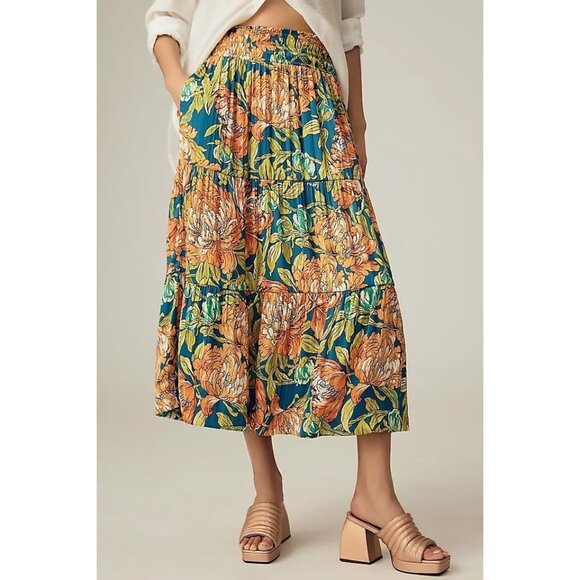 Anthropologie Somerset Maxi Skirt Size M Floral Blue Orange Tiered