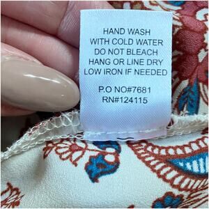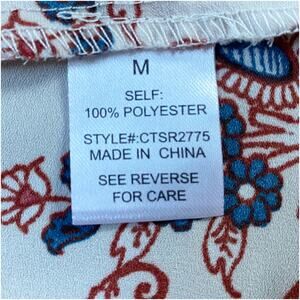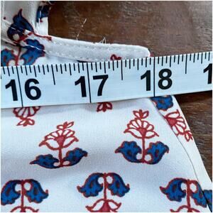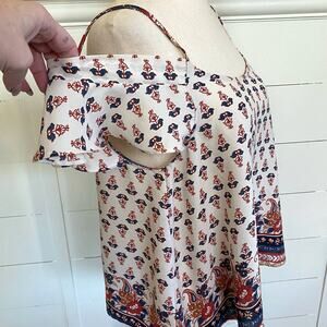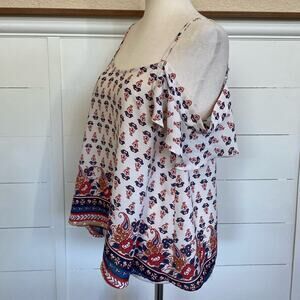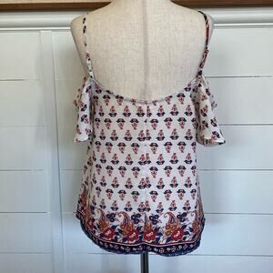 Cute light airy off the shoulder top. Features flowers and border print in shades of red, blue, white and tan. Adjustable straps. condition.