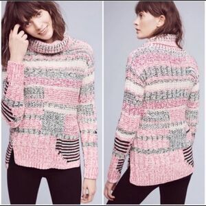 Anthropologie Sparrow Alma Chunky Knit Pink & Black patchy turtleneck sweater size Small. Great condition. Small front pocket. Slits on sides. Shorter in front