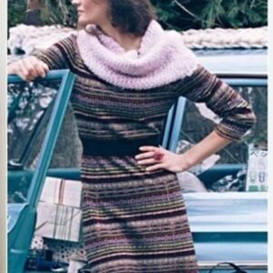 Colorful and cozy knit dress is a slim pullover shift about midi length.