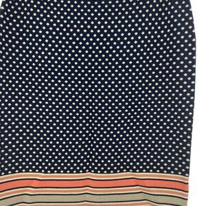Straight sweater knit skirt in navy blue with cream dot print and pink and cream stripe detail at Waist and hem. Elastic Waist. Pull on.
