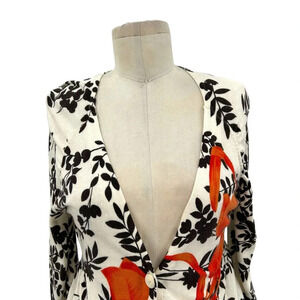 Ivory cream with allover brown leaf vine and rust orange floral print. Long sleeves. V-neckline with buttons down front.