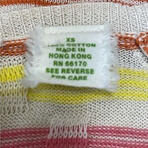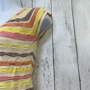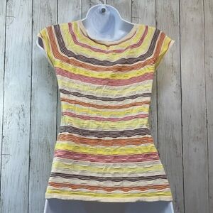 Multicolored stripes, cap sleeves, 3 button closure, lightweight, stretch, textured, colors may vary due to lighting, good used condition, XS
