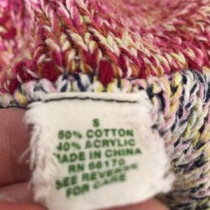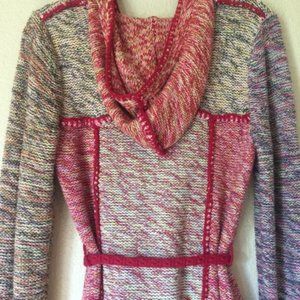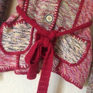 Multi-colored patchwork, knit, belted Train of Thoughts cardigan sweater by Sparrow from Anthropologie, size small in excellent used condition