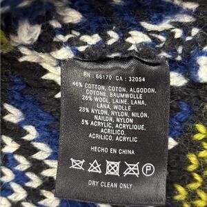 Used, great condition. Some of the yarn shows wear. Black knit sweater with collar. Full zip closure with yarn tassel. Aztec style, geometric designs on arms and around the bottom. 46% cotton, 26% wool, 23% nylon, 5% acrylic. Has front pockets. No size tag, fits like a medium in my opinion. Approximate measurements shown in photos.