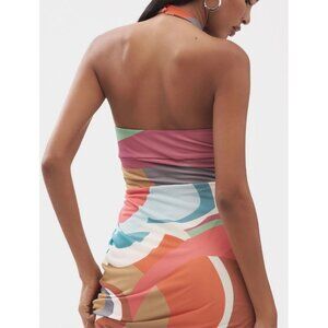 Crafted for a chic aesthetic, this halter midi dress features a vibrant abstract print and a flattering square neckline.