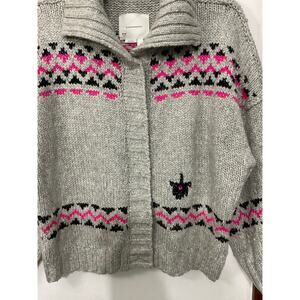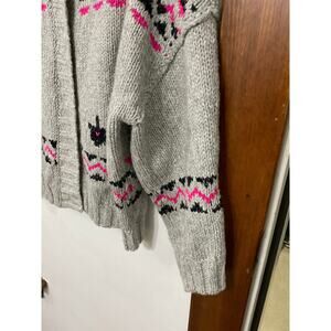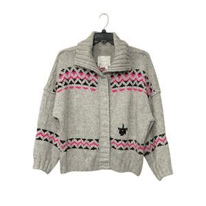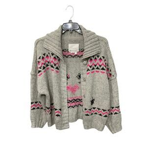 Anthropologie Squirrels Hearts Motif Collared Cardigan Sweater Snap Front, Grey with Sparkles, Size Medium, Oversized, Very Thick and Warm, Cotton/Acrylic/Polyester/Linen/Nylon/Elastane. Great condition!