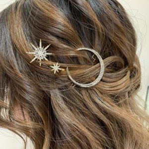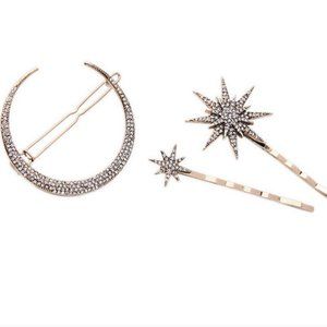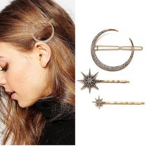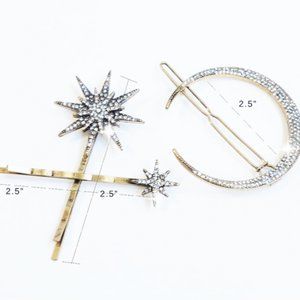Each collection comes with two starburst bobby pins — one large star, one dainty star — and one crescent moon hair clip. Colored in bronze, and set with silver rhinestones. These will surely sparkle up your ensembles for every season