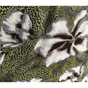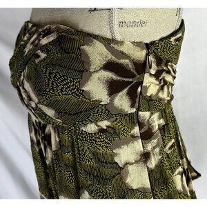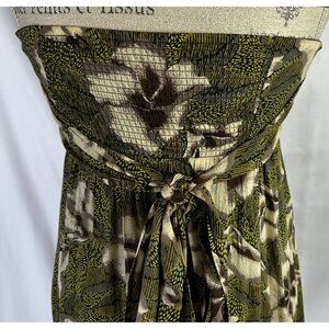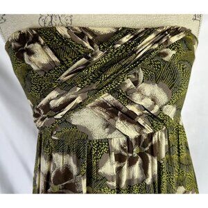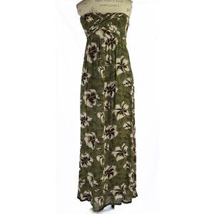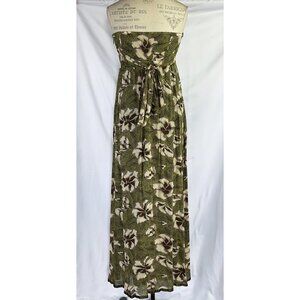 Very beautiful, flowy green maxi dress with, tropical brown floral print, side pockets, pleated design at the bust, shirred back panel with self-tie straps at the back, side zipper.