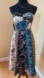 Chic strapless dress with a patchwork design. Features black, blue, and cream floral patterns. Perfect for stylish outings.