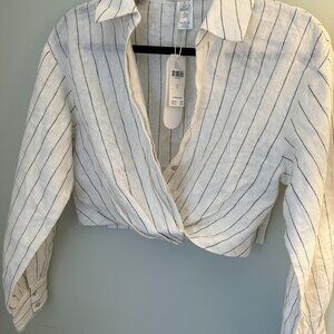 Chic striped blouse from Anthropologie. Features a wrap design and long sleeves. Perfect for a stylish look.