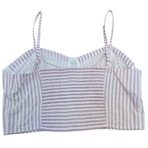 Stylish crop top with purple and white stripes. Features thin straps and a smocked front. Perfect for casual outings.