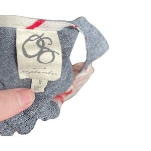 Beautiful red, white and blue summer tank with chambray fabric around shoulder, stripes on front and tropical print on back. Soft cotton front with silky back panel. Lightweight and stylish — perfect for summer days or layering. Brand is One September bought at Anthropologie.