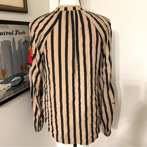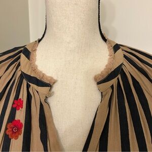 Beautiful Blouse from Anthropologie. Rich Embroidery on Tan with Black Stripes. Rayon. Pretty Ruffled Collar. Nice design and quality.