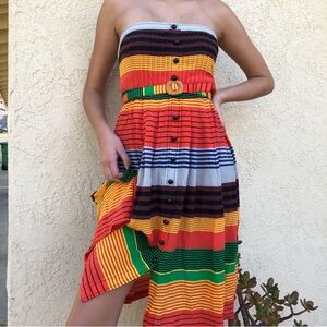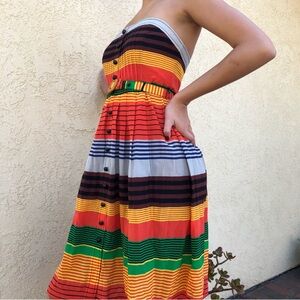 Vibrant striped midi dress by Anthropologie. Features bold colors and button details. Perfect for a statement look.