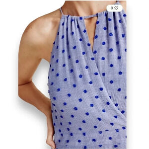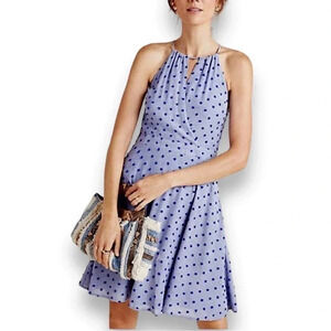 Anthropologie Sunday In Brooklyn ‘Naya’ Fit & Flare Blue Polka Dot Dress Size XL. Adjustable halter neck with surplice neckline and cut-out detail, Side slant pockets, Back zipper. Fabric: Rayon/Poly/Nylon woven clip dot fabric with nylon/rayon lining. Approximate measurements: armpit to armpit 17.75”, waist circumference 35.5”, length from top of waistband to hem 22.5”. In excellent condition.