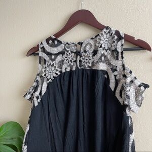 Super cute black and white patterned cold shoulder blouse. Patterned across the front and onto the back shoulders. Semi sheer lace panels under cold shoulder on arms.