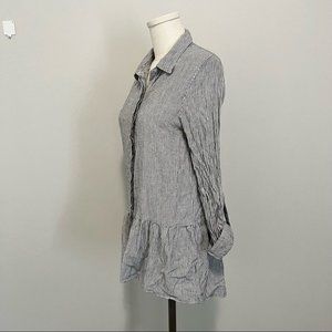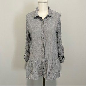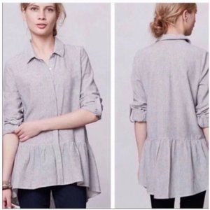 The Wiley Blouse by Sunday in Brooklyn from Anthropologie. A classic look makes this piece a wardrobe staple that will never go out of style Charcoal Grey and cream pinstripe button front shirt Dropped ruffle peplum hem line Back slit Long sleeves with roll up button tab High low hemline Relaxed fit 100% cotton In really great pre owned condition