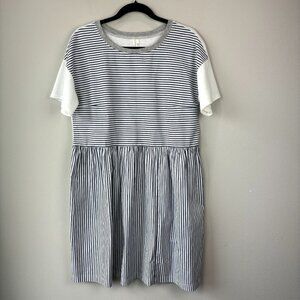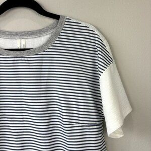 * Features: cotton blend, white and blue stripes body, contrasting solid white short sleeves and back, pullover styling, elastic waistband, , unlined