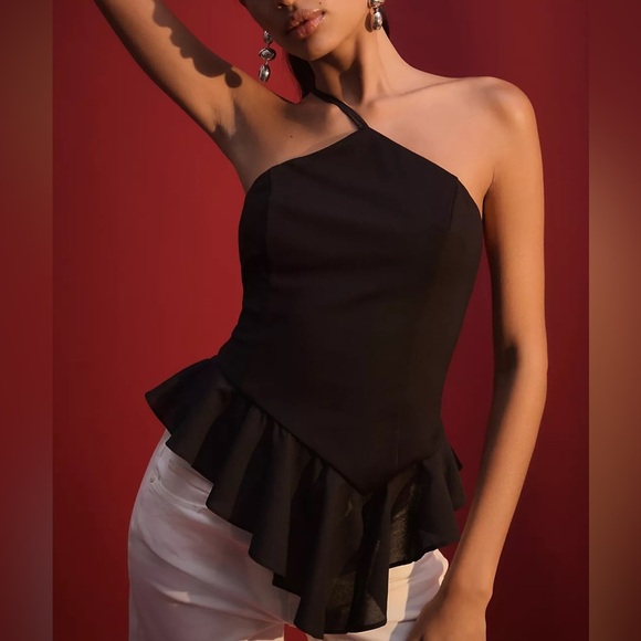 Tags: Anthropologie top, Sunday in Brooklyn, asymmetrical halter top, black ruffle blouse, women’s dressy top, elegant blouse, evening wear, date night top, summer blouse, lightweight top, casual chic, trendy blouse, versatile women’s clothing, boutique fashion, pullover top
