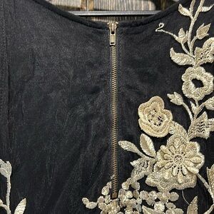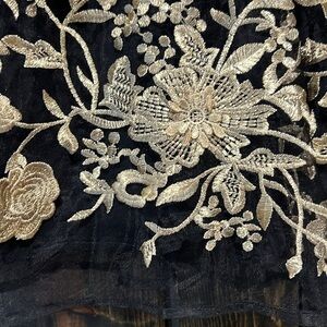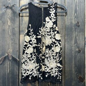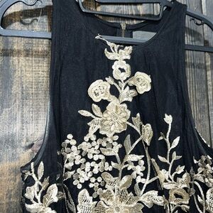 Anthro brand Sunday in Brooklyn floral top. Size small. Black & gold. Floral overlay. Sleeveless. Tank style. Beautiful dressy top. Holiday sparkles. Zip up back. Preloved. Please see all photos for condition. Marks on the underarm (looks like deoderant) should wash out with proper cleaning.