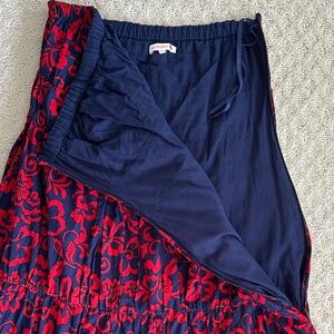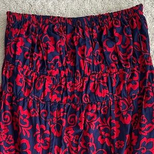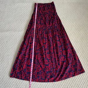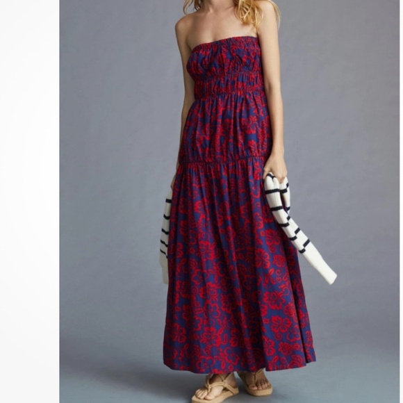 Anthropologie Sundry Aloha Floral Strapless Maxi Dress - Size 1 (Small/4-6) - Boho/Casual/West Coast. Putting a chic French twist on West Coast style, Sundry represents a refined take on get-away inspired weekend wear. Designed by Provence-born Matthieu Leblan and crafted in California, each "Almost French" piece is an instant, iconic classic. Features 100% cotton fabric, all-over floral print in navy and red, strapless style with elastic at the top, maxi length, hidden side zip with hook/eye closure, tiered, and fully lined. Excellent pre-owned condition!