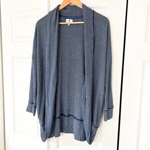 Soft and cozy Anthropologie Sundry brushed fleece cocoon cardigan in a blue and white micro-stripe. Features an easy open-front drape, relaxed fit, and lightweight fleece texture—perfect for layering year-round.