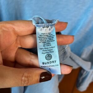 Anthropologie Sundry tee, 100% pima cotton top, women's 1X light blue ruffle sleeve shirt, lightweight summer tee, soft cotton crewneck blouse, casual boho chic top, layering-friendly short sleeve top, relaxed fit everyday shirt, elegant cotton top, sustainable natural fiber tee.