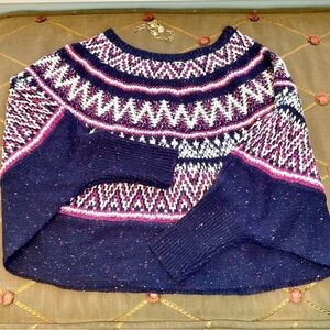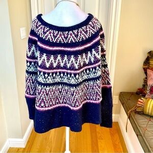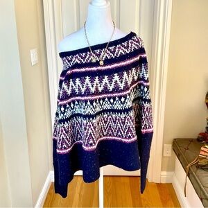 Beautiful fall and winter ready poncho sweater with arms, blue magenta pink white fair isle print