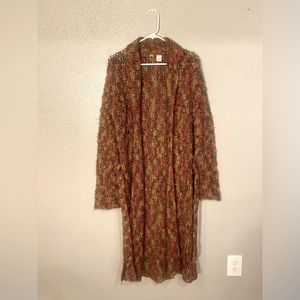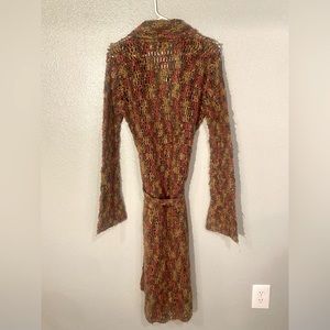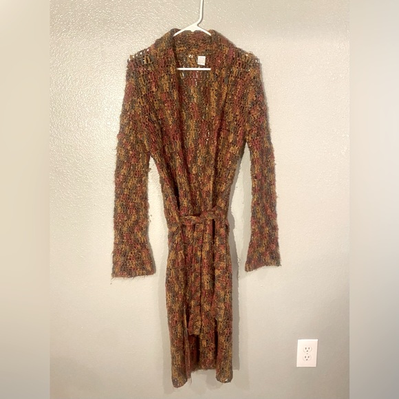 This piece is so well made. It’s comfy with or without the belt. No need to stay home in it! I didn’t :-). Some piling. Approx 50” length, 30” arm. Belt length approx 75”