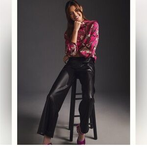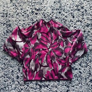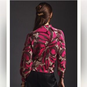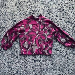This Anthropologie sweater features a stylish boxy silhouette in a striking pink and gold color scheme. The bell sleeves and mock collar add a touch of sophistication, making it a versatile addition to any wardrobe. Perfect for both casual and formal occasions, this top effortlessly combines comfort and style.