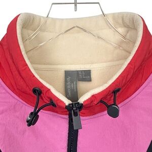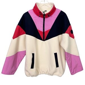 Fantastic retro style pullover in a combo of cream fleece and multicolored windbreaker fabric. Sold at Anthropologie.