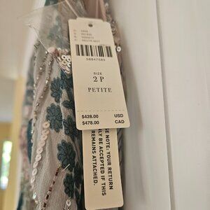 Although preowned, the dress is brand new with tags and in near perfect condition. A rare petite size (2P), it's perfect for someone seeking a tailored, floor-grazing fit without alterations.