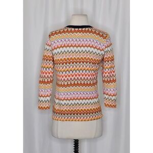 Rounded neckline ~ Three-Quarter length sleeves ~ Straight hemline ~ Button closures all the way down the front ~ Slightly cropped length ~ Fitted silhouette ~ Soft unlined 100% cotton knit fabric ~ Colorful ikat inspired geometric pattern in horizontal rows … in various shades of orange, green, yellow, white and purple ~ Solid navy trims at the neckline and button placard