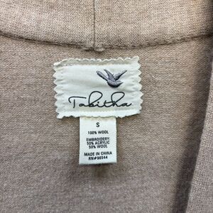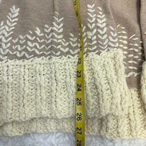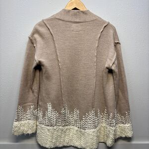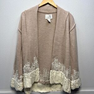 This cozy Tabitha cardigan from Anthropologie features a soft 100% wool knit in a warm beige tone with unique white embroidered detailing and chunky knit trim. Open front style with a flattering drape. Size Small. Great pre-owned condition with no flaws.