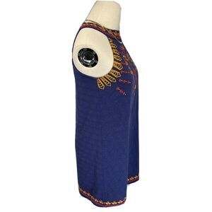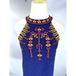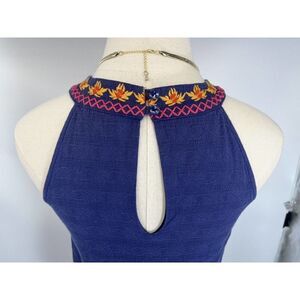 THML Halter Dress With Orange Yellow Embroidery Mini Dress Size XS Anthropologie Brand. Measurements in photos. 100% Cotton liner is polyester. Key hole Backing with two buttons. Color is more navy blue color. Some photos may show brighter blue. Very good pre-owned condition. No rips, holes, or stains. Comes from a smoke free environment.