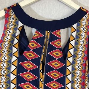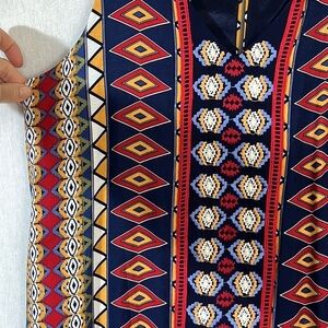 Beautiful sleeveless dress. Features a colorful geometric pattern and beautiful embroidery. The back has a fun cutout. It is very soft and comfortable.