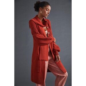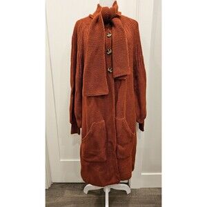 The Anthropologie + TINY Orange Wool Blend Layered 4 Button Shaw is a women's size large. Made from a wool blend material, this shawl features a vibrant orange color with a shaw. Perfect for adding a pop of color and warmth to any outfit, this shawl is a stylish and cozy accessory for the colder seasons. P2P @ 20.5", Hem length @ 38", Cuff length from neck @ 26".