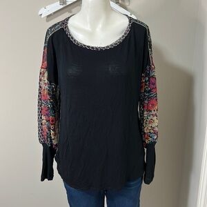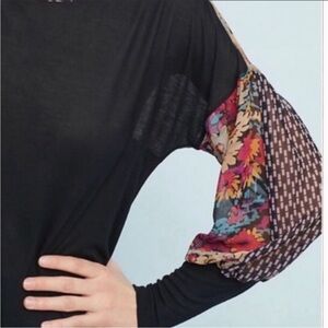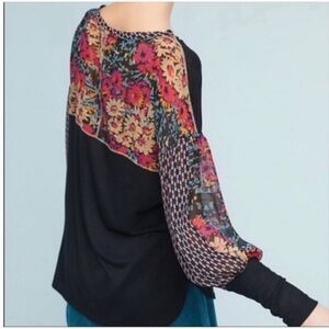 Anthropologie TINY Raye Black Floral Sheer Sleeve Top Boho Round Neck Sz M