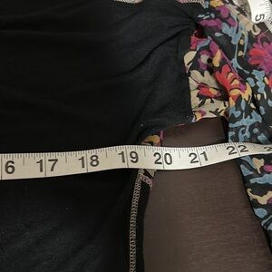 Stretchy Black fabric with black, red, turquoise, tan, red, purplish wine, and lavender floral and geometric print on sleeves and back