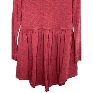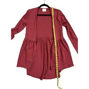 Beautiful Anthropologie T.LA open-front cardigan in a soft reddish hue (color may vary by screen). Features an oversized fit, long sleeves, and a flattering gathered hem/peplum-style back that adds movement and drape. Longer in the back for an easy, flowy silhouette. Made of 100% cotton, machine washable, and perfect for boho layering or casual everyday wear. Excellent pre-owned condition with no noted flaws. Measurements provided in photos.
