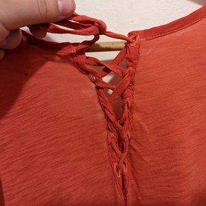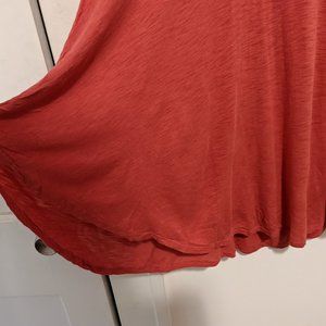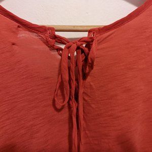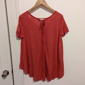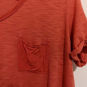 Easy summer tee by T.La for Anthropologie! Red pocket tee with short sleeves and relaxed, swing silhouette. Curved bottom hem, back seam detail, and rolled sleeve details. Contrast pocket and neckline trim, back lace-up detail with removeable ribbon. Pullover styling.